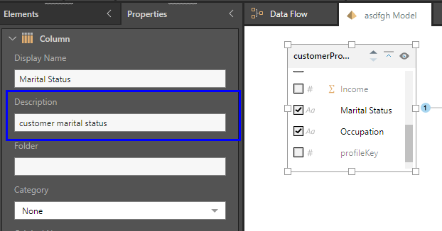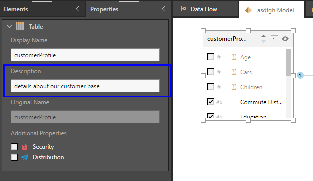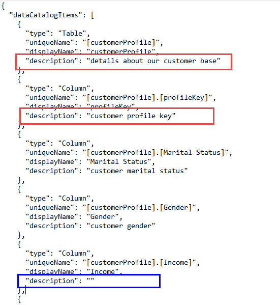 The model will be downloaded as a JSON file. Each table and column will feature a "type", "uniqueName", "displayName", and "description" field. In the description field, you can add descriptions to each table and column as needed. Be sure to save any changes.