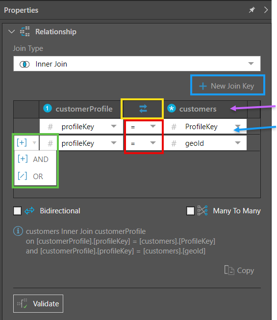 Join keys are edited from the Relationship window in the Properties panel of the selected join. The join key table shows the tables being joined (purple arrow below), the join direction (yellow highlight), the join key columns (blue arrow), and the join key operator (red highlight):