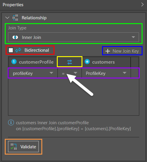 Joins can be one-way or two-way (bidirectional). The most common type is one-way, and this is the default in Pyramid. You can make a bidirectional join by enabling the 'Bidirectional' option from the join's Properties (red highlight below).