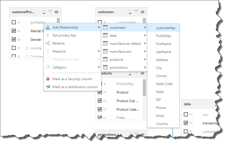 New joins can be added from a given column in a table, to a selected column in another table. Joins can be edited from the Join context menus, and from a selected join's Properties panel.