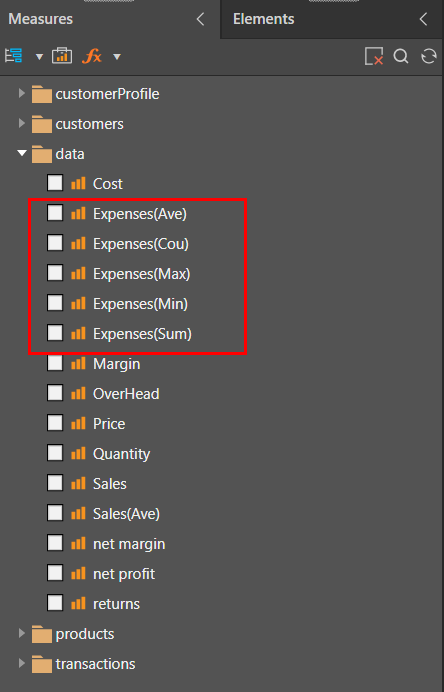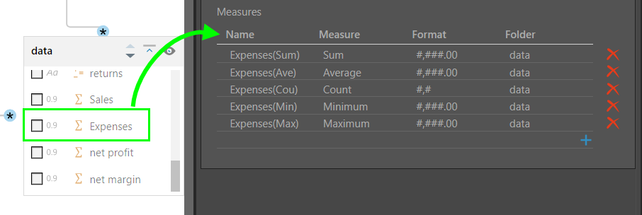 When the model is processed, multi-measure columns produce multiple distinct measures that are organized into the given measure folder. In the example below, we see 5 different measures for Expenses (red highlight below):