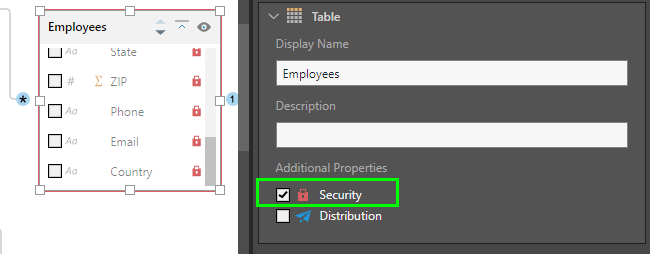 You can set given tables and columns for the specific purpose of security and/ or distribution. Security tables and columns appear only in the dynamic member security panel in the Admin console. Distribution tables and columns are visible only when configuring data mapping distribution for publications. Aggregated tables are not visible to users of the model, but are used automatically by Pyramid's query engine to speed up certain types of query.