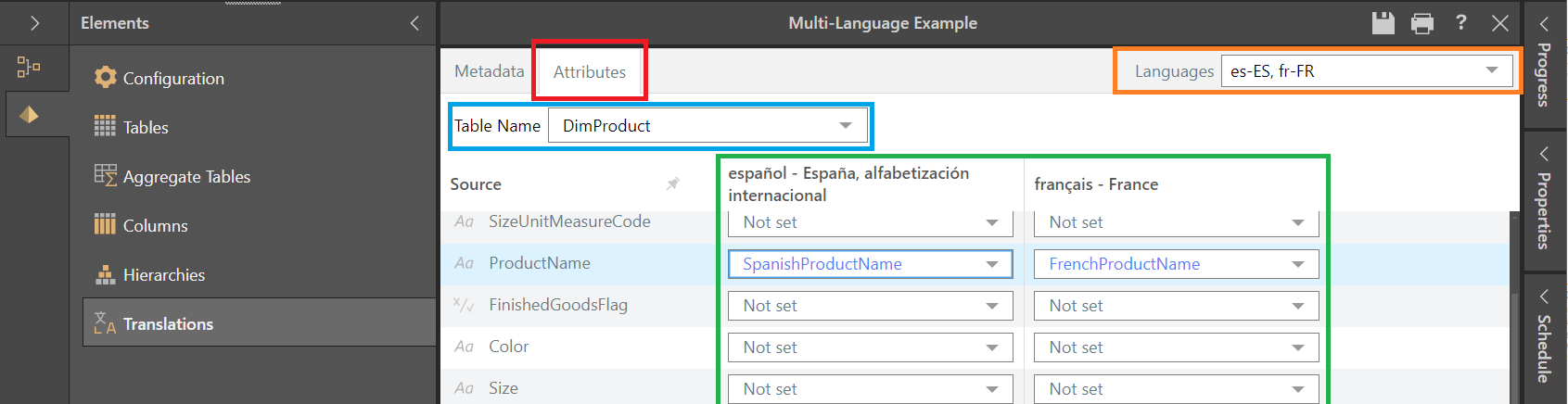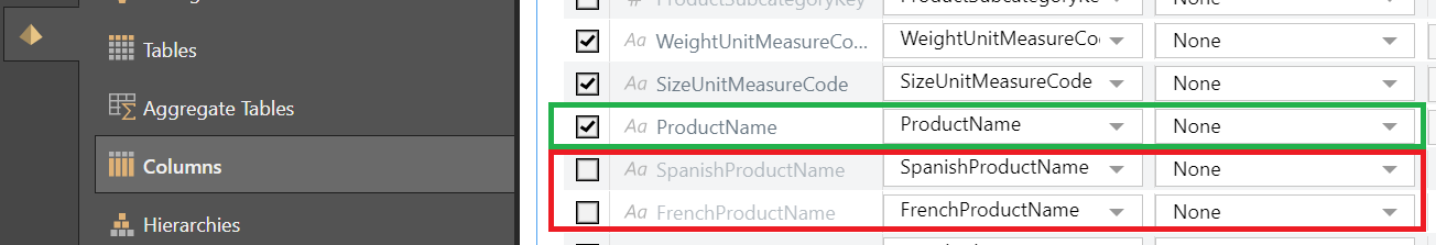 Note: In this example, the column name ProductName was selected (checked) in the Columns panel. The FrenchProductName and SpanishProductName were both deselected (unchecked). Any unchecked attribute is shown in the drop-down as a potential choice for the translation mapping attribute.