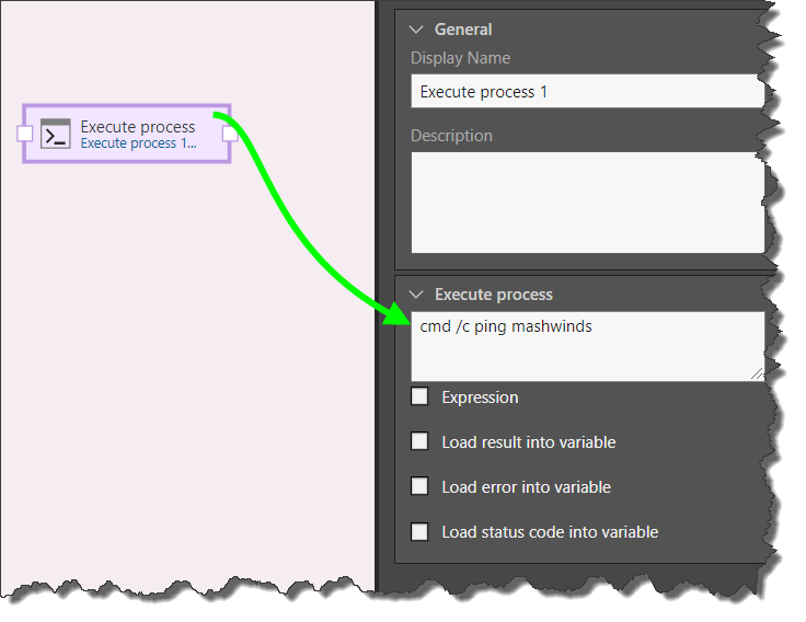 Add the Execute Process node and enter the command in its script window. In this example, a simple script is entered to ping the server: