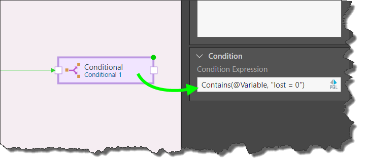 Configure a PQL expression on the Conditional node; in this example the Contains function is used: