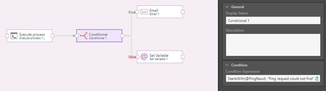 In this example, the Execute Process node is used to ping a URL, and the results are loaded into a variable called PingResult. The Conditional node is used to determine what happens next, based on the results of the ping. The Condition Expression is: