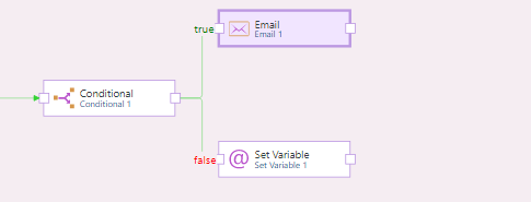 If the condition is true, the Email node will be executed. If the condition is false, the Set Variable node will be executed: