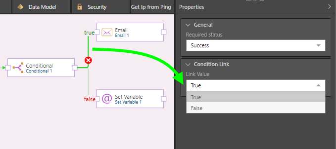 To edit the connection's link value (true or false), right click on the connection to open its Properties panel, then choose the required link value: