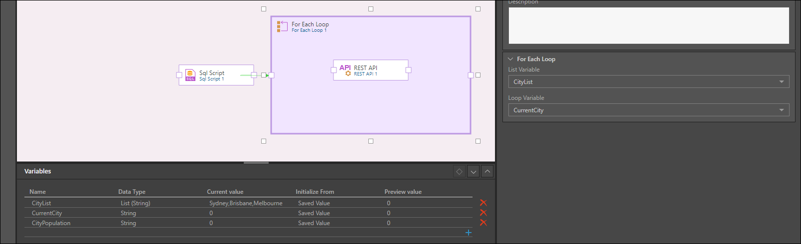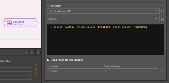 In the example below, an SQL script is used to load a set of 3 Australian cities into the list variable "CityList".