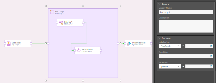 The initialization, condition, and increment values can be static integers, or dynamic PQL functions. You can construct a PQL expression by writing or pasting it directly into the field, or by opening the PQL Editor.