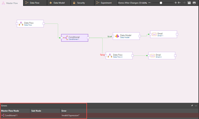 If there are any invalid nodes, you will see the red error message. You'll also see all invalid nodes listed in the Errors panel: