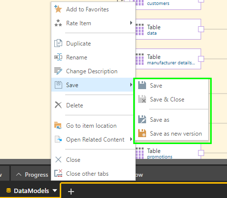 If the item was already saved, you can save, save as, save and close, or save a new version: