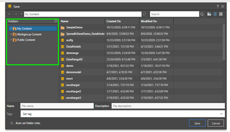 Content sharing is based on security roles, with predefined folders that allow role-based access. From the Save and Save As dialogs, you can save your model file to your own private domain, without sharing it, or you can share it with users who share your security roles, or you can specify the roles with which you want to share it.