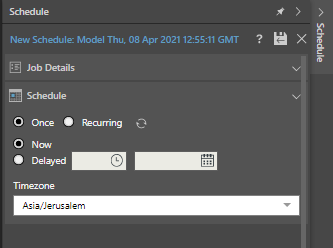 Under Schedule, set the schedule to 'Once' or 'Recurring'. If you create a one-off schedule, then choose whether to run the job immediately ('now') or at a later date or time ('Delayed'). Lastly, set the time zone.