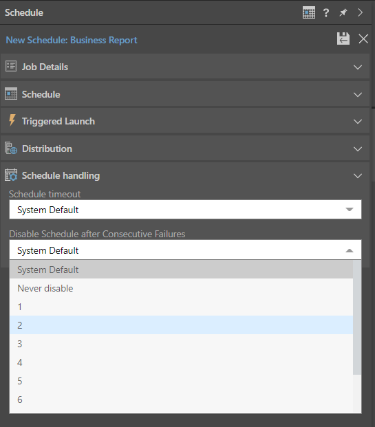 - Disable Schedule after Consecutive Failure: The maximum number of times the task will attempt to run before it is abandoned. Once a task has failed more times than this value, the task will be canceled and will only run if it is manually restarted. Never disable means that the job will run without aborting.