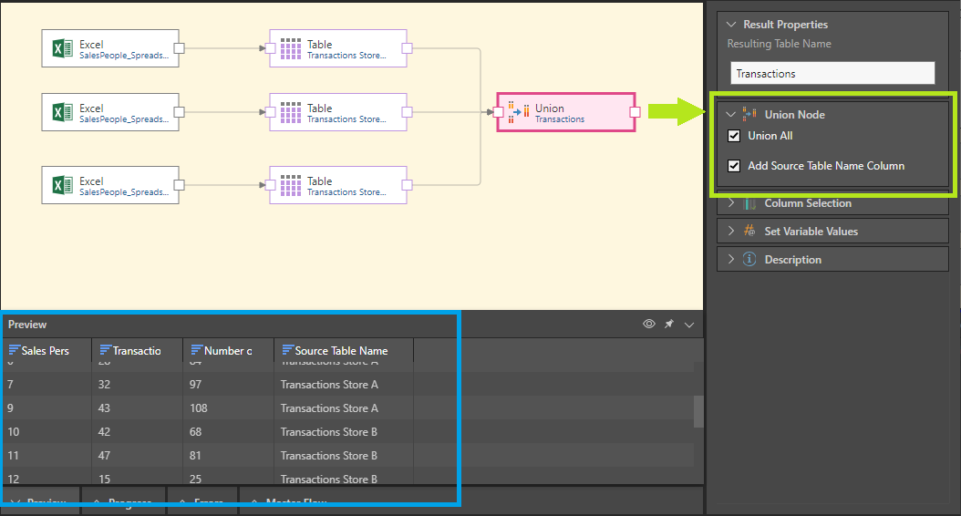 - Union: create a union between 2 or more tables, combining rows from each table and adding the union to the database schema.