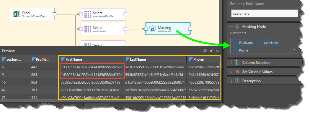 Connect the Masking node to the Select node representing the relevant table. Go to the Properties panel and from the Masking Node window select the relevant columns form the drop-down list. Each row in the given column or columns is replaced with a random string.