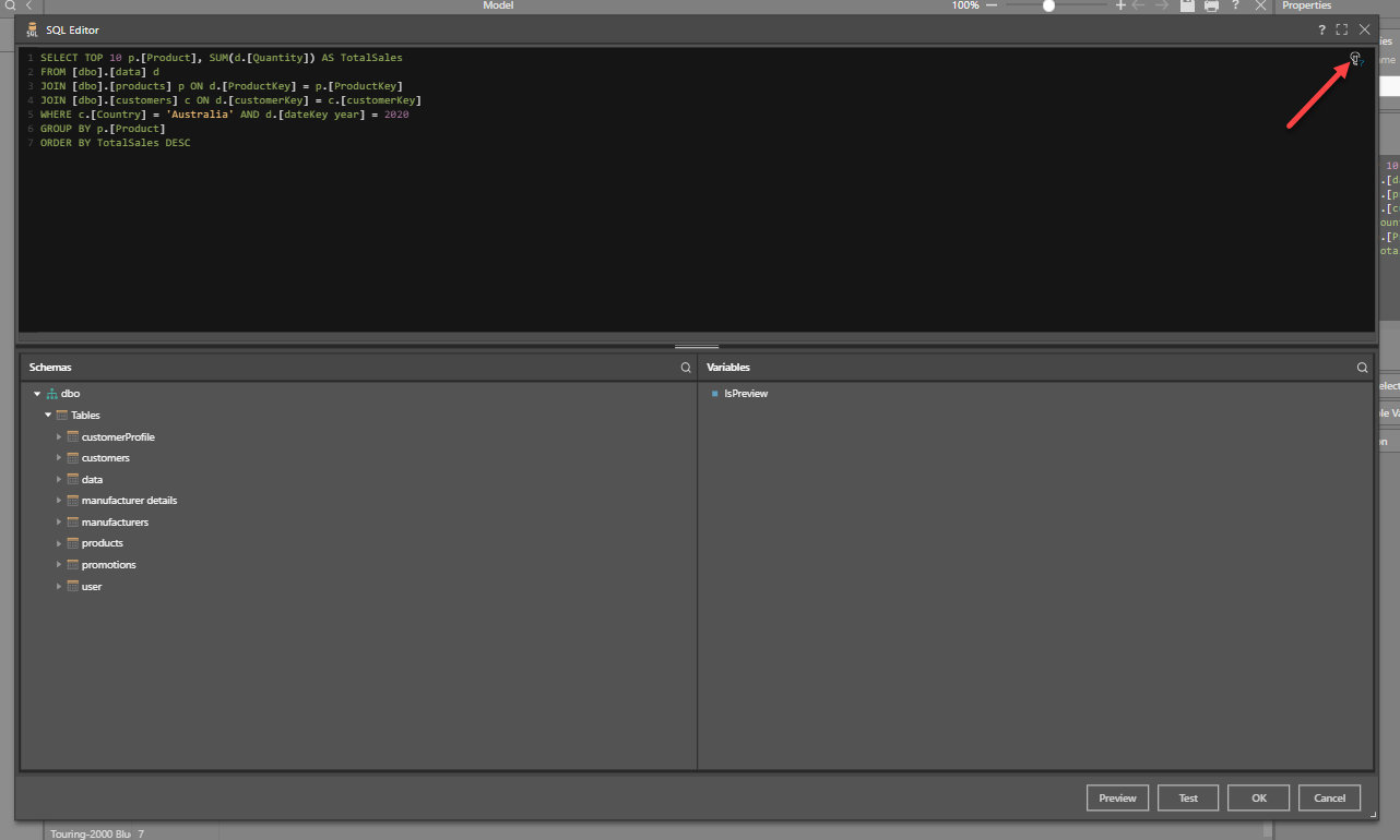 Open the Script Editor from the Properties panel. This editor shows the data source's schemas; you can easily add tables and columns to the SQL, MDX, or DAX statement by double clicking or dragging and dropping. The editor also exposes any variables that have been configured in the Data Flow, enabling you to inject variables into the SQL statement.