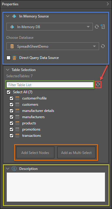 - Refresh the table selection - if tables have been added or removed from the datasource, click the refresh button (red highlight), so that the changes will be reflected in the table selection