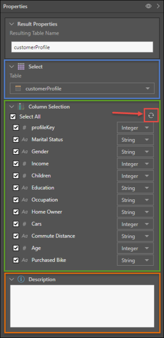 - Refresh the columns in the selected table to update changes in the data source (indicated below in red)