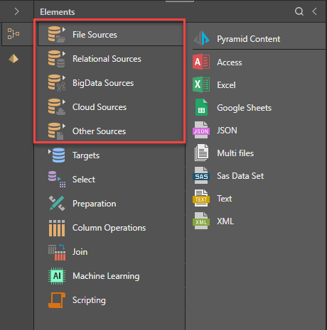 Pyramid supports a variety of datasources, including local files, relational databases, unstructured databases, web sources, and scripted sources.