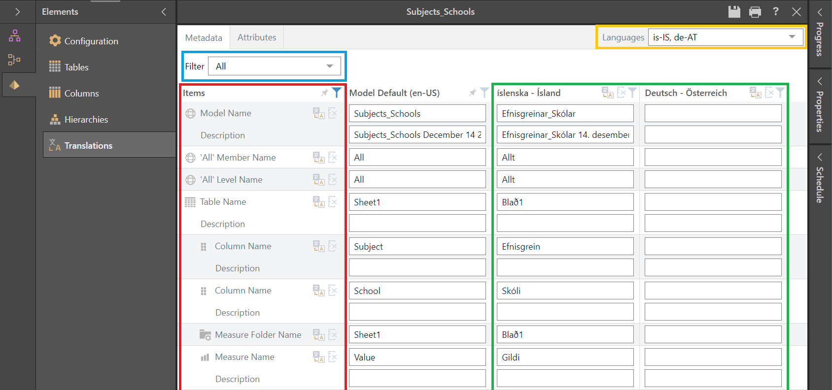 - Items: (red) The names of the items in the model whose labels may be translated. Includes the model name, description, column names, and so on. Which items are displayed is affected by the Filter.