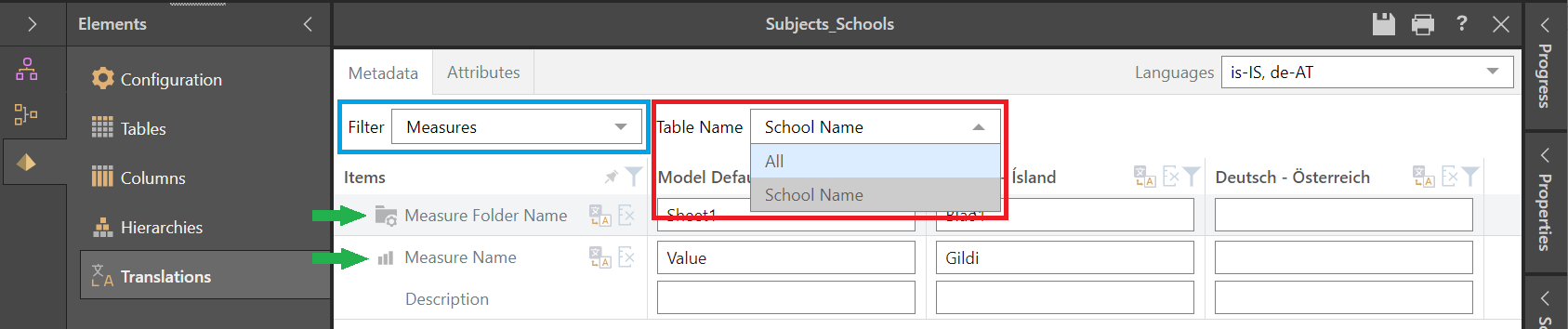- Selecting Measures (blue box below) allows you to define translations for the measure folders, and the measures and descriptions for the tables.