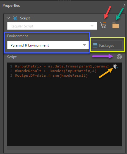 There are a few ways in which to construct your R script: they can be downloaded from the Pyramid Marketplace, imported from the Pyramid content manager, or written or pasted directly to the R node's Properties panel.