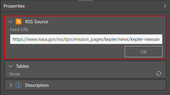 To connect to an RSS feed, add the RSS node to the data flow. With the node selected, go to the Properties panel and paste the RSS feed's URL in the 'Feed URL' field. Click 'OK' to confirm the URL and convert the feed into a single table.
