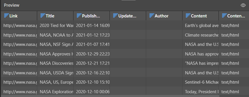When the new table node is previewed, we see that each RSS element has been converted into a column, with each element's values listed in the appropriate column: