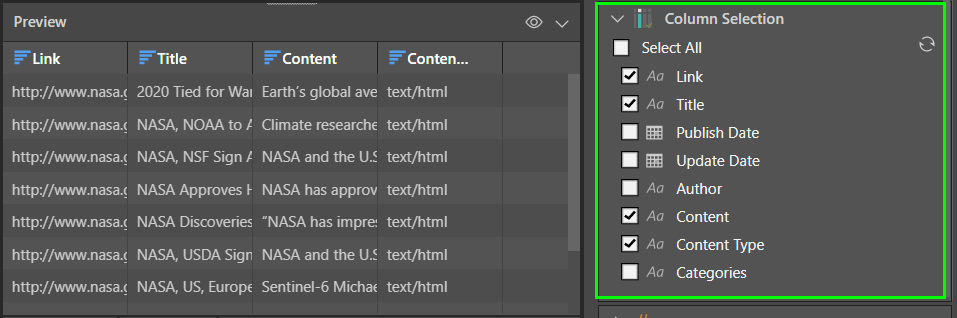 All of the columns listed above are returned, regardless of whether or not all those elements exist in the RSS source. For example, the RSS feed in these images does not include the <lastBuildDate>, <author>, or <categories> tags, but those columns are still generated. To remove empty columns, deselect them from the Table node's Column Selection window.