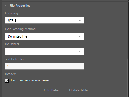 Once the file is selected, the file properties must be set. Because this is a comma separated file, the reading method is set to 'Delimited File' and the comma delimiter is selected. And as each column contains a header, the 'First row has column names' option is enabled: