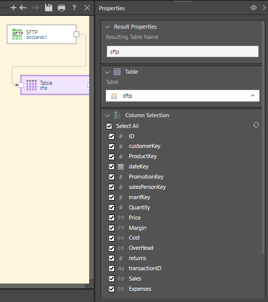In this example, the SFTP node was added to the Data Flow and used to convert a .csv to table, using the Text file type: