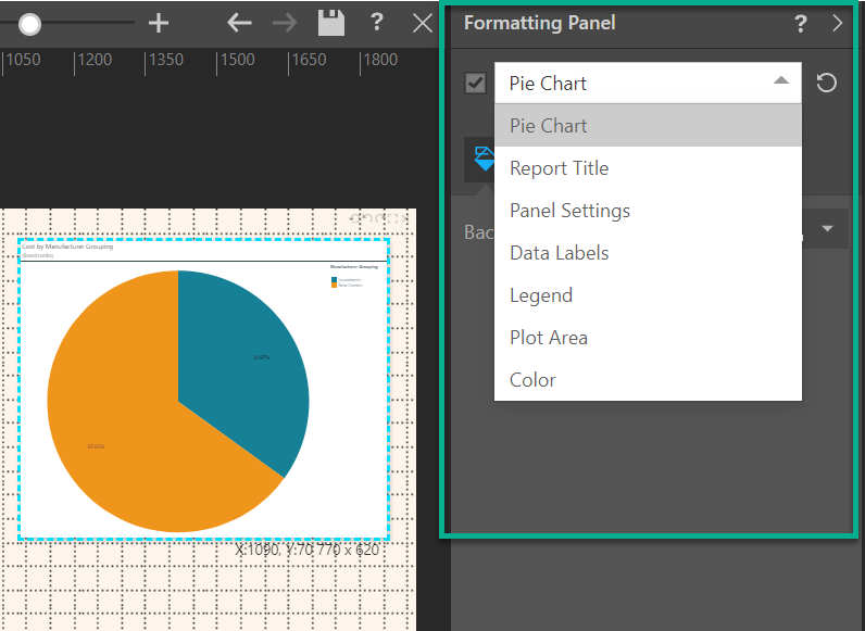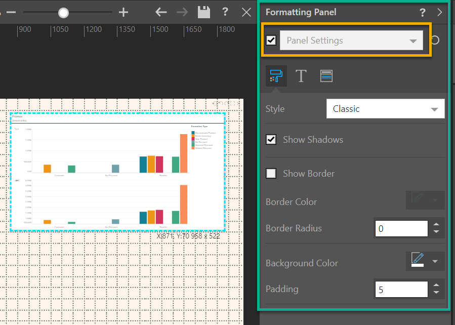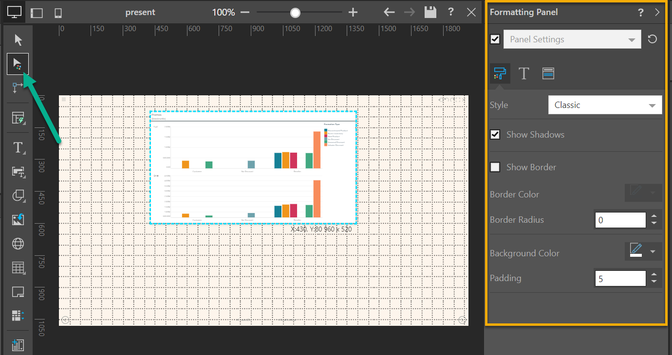 The formatting panel is designed to be used in conjunction with the formatting selector. This transforms the canvas into an intuitive, point-and-click formatting area. Hover your cursor over the components on the canvas to highlight those components for selection. Clicking an "activated" component opens its formatting options in the Formatting panel.