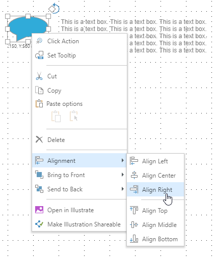 Since only one item is selected on the canvas, choosing Alignment > Align Right moves the selected item to the right of the canvas.