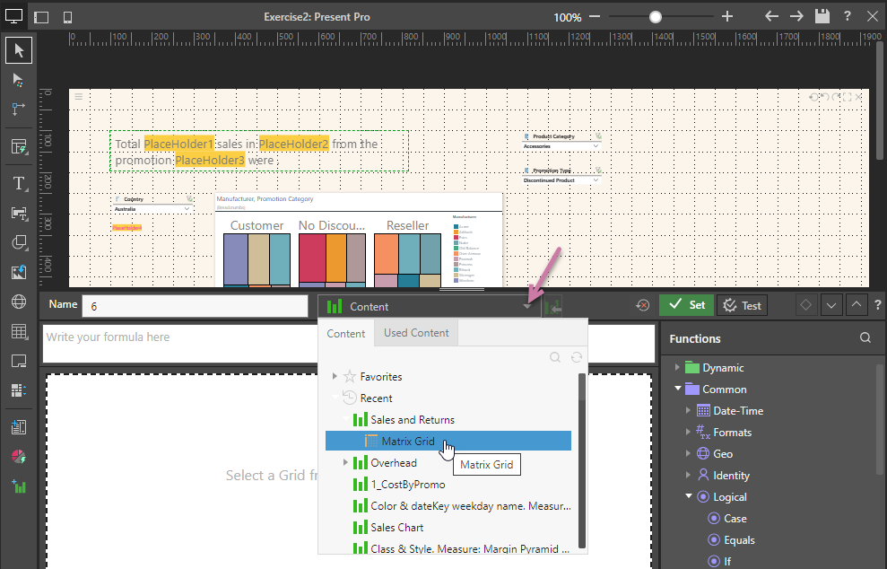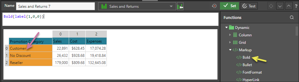 The functions in the Dynamic library can be used to apply Markup to your value, to make selections from or manipulate content from the grid, column, or row, or to return smart (AI-driven) content. For example, you can use Italics(data(0,0)) to transform the returned value from cell 0,0 into italic text or Format(TotalColumn(1), "%,.2f") to get the total value from column 1 and format it with two decimal places. The functions in the Common library can be used to manipulate the returned value, for example, you can use LLM("what is the meaning of" + label(1,0,0)) to use the underlying LLM to return a long-form text description of the "Customer."