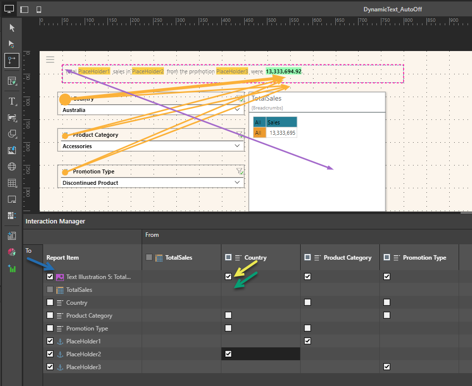 - You can create an interaction between a slicer, visual, or target and either the Text Illustration (yellow arrow) or, if it is also on the slide, the matrix grid or visual area that drives the dynamic text functionality (green arrow). In either case, select the checkbox at the intersection between the two items (From and To) to create the interaction. You cannot select both intersections, since they are effectively the same.