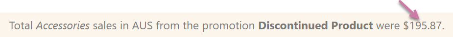 You should always check that your changes have the effect you intended. Open the presentation at runtime by clicking Run or F2 and update any interaction options to check the contents of the dynamic text responds as expected. For example, select the three options on the slicers to filter the sales total that your dynamic text field represents by your selected country, product category, and promotion category: