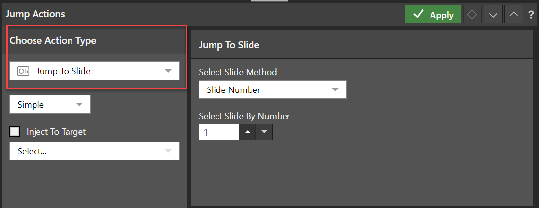 Dynamic jump actions are assets (buttons, images, text boxes, and so on) that have been assigned a user-defined "click action," which is triggered when it is clicked at runtime. These click actions can be used to open another slide in the presentation, to open a different content item, open a URL, and more.