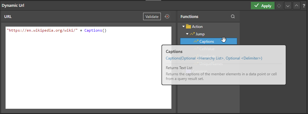- Add the function that drives the interactive behavior to the URL field. This example concatenates the URL and the captions (selected member element name):