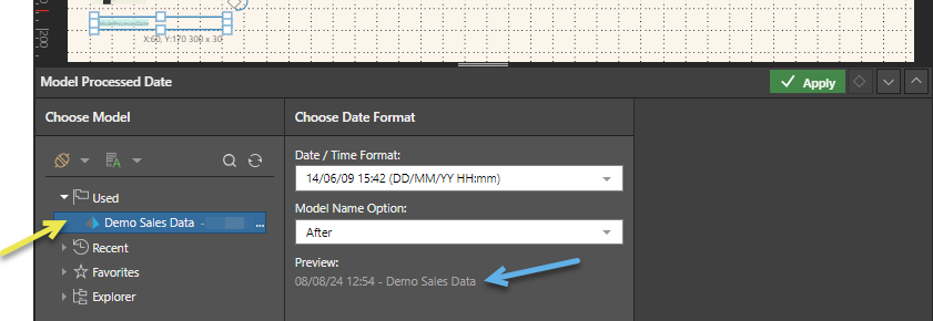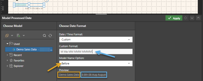 The Choose Date Format panel opens. Note that, as you make your selections in this panel, the preview updates to show the model processed date for your selected model in your selected format (blue arrow above).
