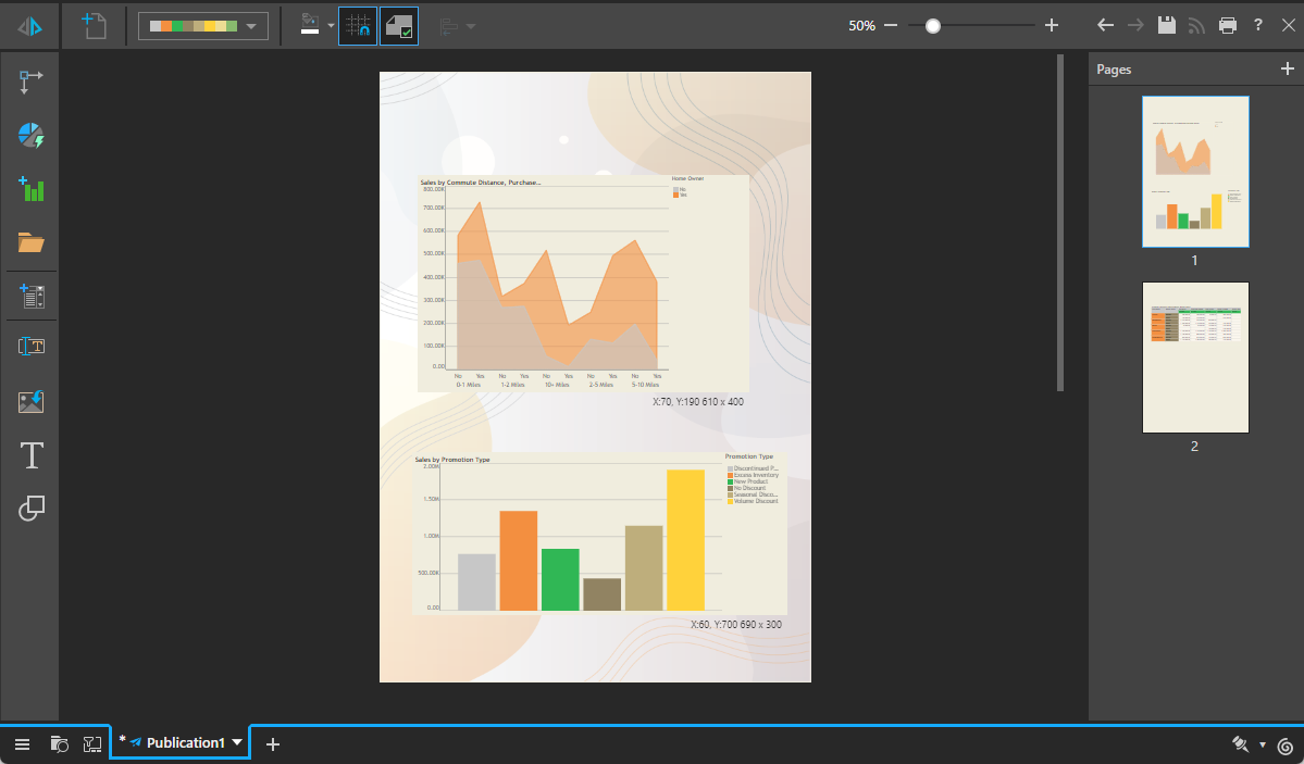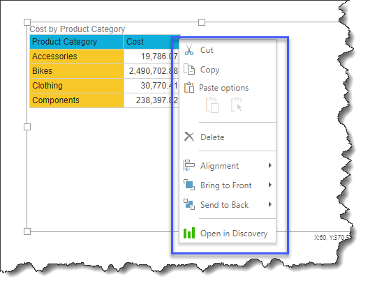 The page canvas, located in the middle of the workspace, is where you build and design your report. Content items, text, images, and shapes are added to the page, where they can be re-sized and formatted as required.