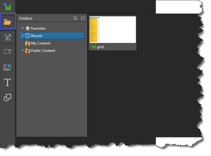 Publish Lite allows you to add existing visualizations that you have access to, from your own private content folder, your Workgroup folder, or a Public folder. These are added from the Content folders.