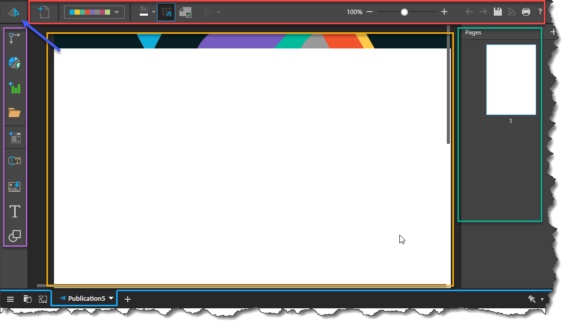 The Publish Lite workspace (also referred to as 'edit mode') offers a streamlined version of the full Publish interface. As in Publish, the canvas is located in the center of the workspace and is surrounded by several key functions to assist in building your publication.