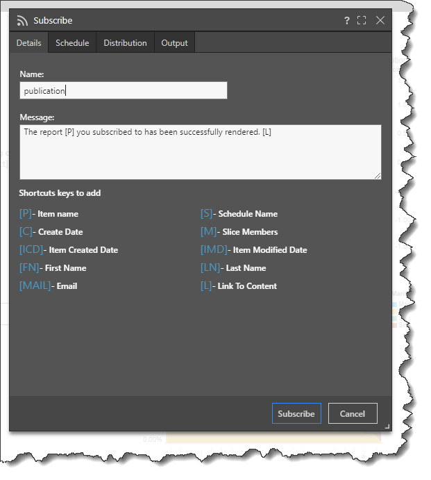 Users can elect to subscribe to a publication (like a Discover report or Present dashboard). In effect, it creates a single, repetitive print of the publication template for a given data selection (if there are slicers), in the document format they choose, for the requesting user who creates the subscription.