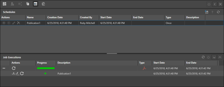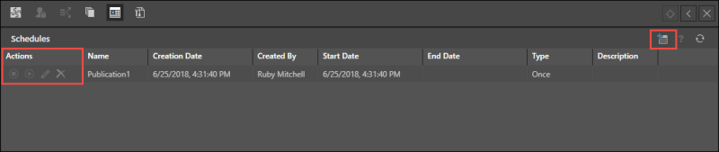 Click the New Schedule icon to create a new publication schedule. In the Actions column, stop or start a schedule, edit a schedule, or delete a schedule: