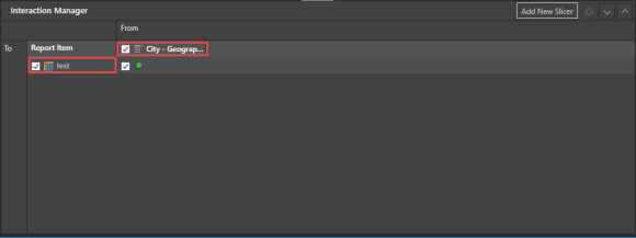 Find the manufacturers slicer in the Content panel and begin dragging it onto the page. Drop the slicer into the Interaction Manager when it appears, and select the checkboxes next to the grid and the map.