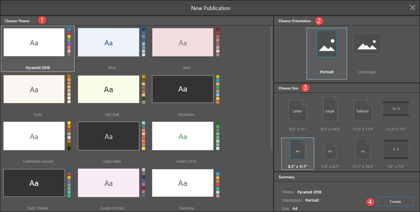 Open Publish, and from the New Publication window select a theme, orientation, and size.