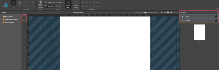To build a cover page or content page template select the corresponding page icon - the publication background will turn blue when properly selected. Drag and drop image files onto the canvas, and use the text tools to add headings and other text. Use the shapes tools to add banners.