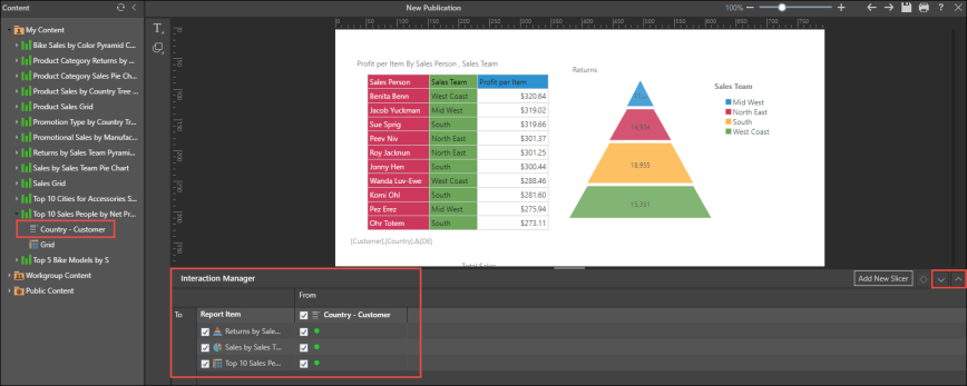 When adding slicers from the Content panel or configuring a new slicer, the Interaction Manager dialog will open along the bottom of the page. Drop the slicer in the dialog, and from the Report Item column, check the visuals that should be filtered by the slicer, then minimize the window.